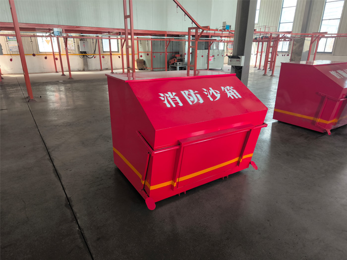 應(yīng)急救火時兩人或一人搬開上蓋,打開箱體上部兩個拉手。干沙靠重力自行流出,兩人或一人用鐵鍬把沙子覆蓋在油上便可以了,通常滅地面流淌火很管用。