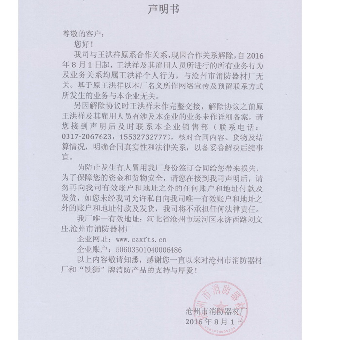 公司名稱:滄州鐵獅消防科技有限公司 公司地址:河北省滄州市獻縣經(jīng)濟開發(fā)區(qū)云臺路東側(cè)307國道北200米 電話:0317-2067623 15532732777 傳真:0317-2064182 手機:15532732777 網(wǎng)址: